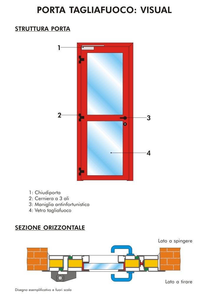 Chiusura con Omologazione di resistenza al fuoco secondo EN 1634 e UNI 9723, e certificata in vari stati dell’area europea, accessori e caratteristiche tecniche di serie come da nostra produzione. Telaio con struttura perimetrale in acciaio zincato con interposto isolamento termico realizzato con profilo sagomato nelle versioni Z-T-L, 3 cerniere a 3 ali registrabili in altezza e in larghezza su cuscinetti assiali a sfere, di serie autochiusura con chiudiporta forza 2-4, inoltre autochiusura supplementare con cerniera centrale con molla incorporata, di serie telaio con zanche per muratura sui 3 lati. Battente con struttura perimetrale di sostegno del vetro in acciaio zincato, con interposto isolamento termico, realizzato con profilo sagomato nelle versioni Z-T-L, serratura ad infilare a 1 punto di chiusura con cilindro tipo Yale con 3 chiavi, maniglieria antinfortunistica (maniglia/maniglia) su placca in resina colore nero opaco, guarnizione perimetrale autoespandente fumi caldi. Telaio e anta verniciati a polveri epossipoliestere colore Avorio chiaro simile RAL 9010, installazione in ambienti interni non esposti al sole e/o pioggia, applicazioni speciali per esposizioni esterne, apertura vista dall’interno a spingere. Spessore battente e telaio, REI/EI2 60 sp. 55 mm, REI 120 sp. 80 mm. Opzioni : telaio con zanche a murare, ad avvitare su controtelaio murato incassato nel muro, a tassellare, maniglieria e/o maniglione antipanico, chiudiporta, elettromaniglia per controllo accessi, sopraluce e/o fiancoluce, vetri trasparenti per esterno esposti al sole, vetri riflettenti per esterno esposti al sole, vetri colorati, vetri sabbiati non trasparenti, abbattimento acustico, verniciature RAL a scelta.